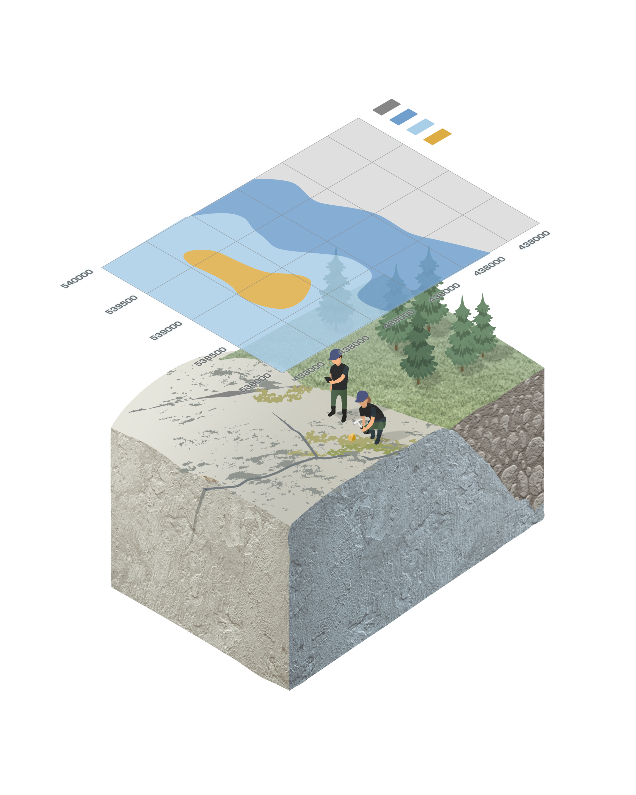 Where there are outcrops, the bedrock is mapped to collect all kinds of geological information that can give clues of where to find economic mineralization. This typically also includes physically searching for geologically interesting boulders that have been separated from the bedrock.