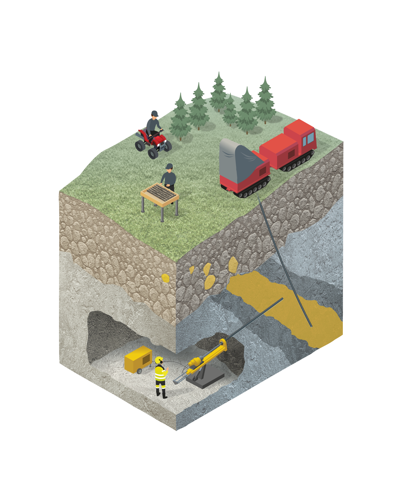 By extracting drill cores from as deep as 2,000 meters below the surface, the bedrock’s geology and possible mineralization can be mapped in depth through logging of the cores. This exploration method is both used from the surface and underground in existing mines.
