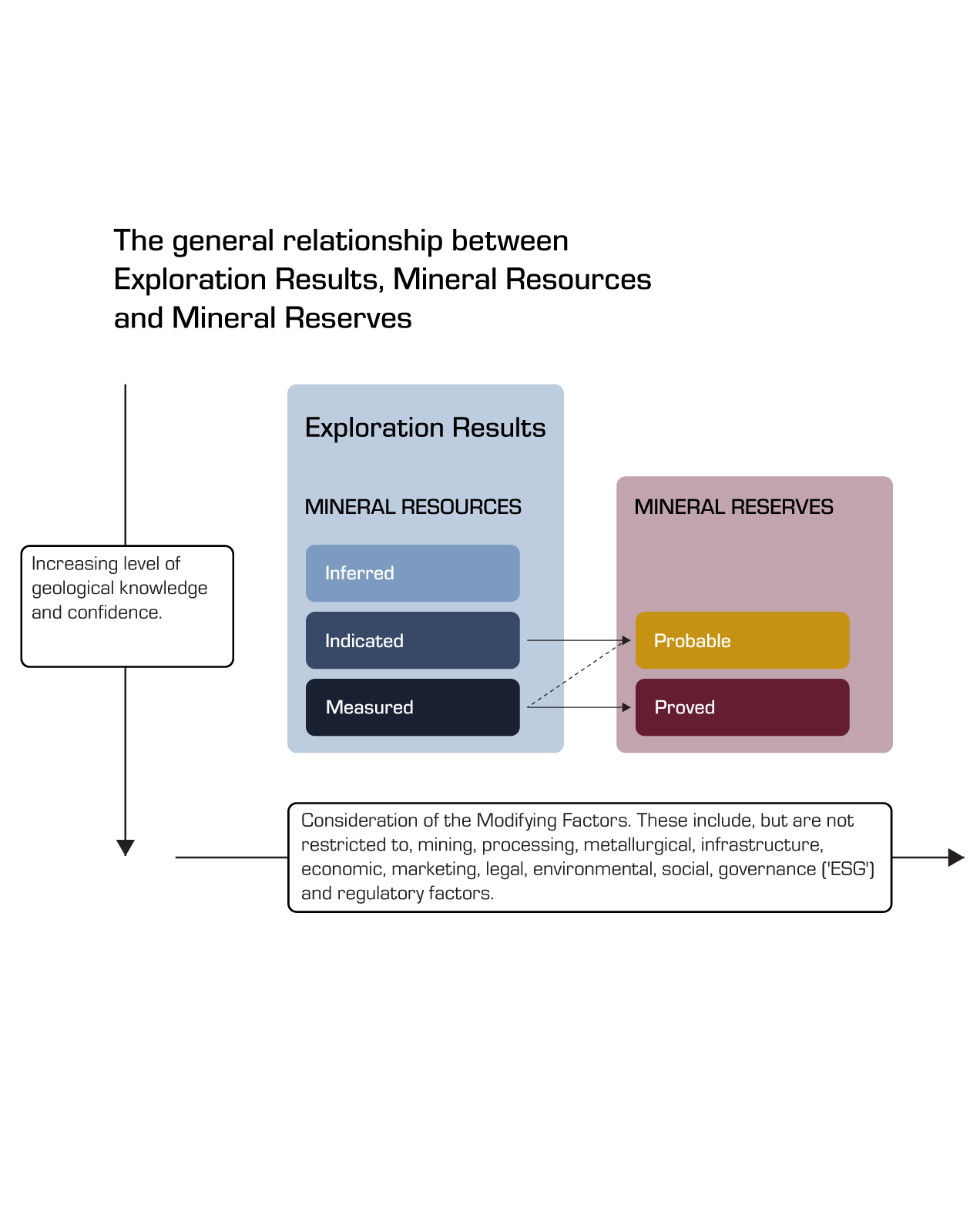 A Mineral Reserve is the economically mineable part of a Measured and/or Indicated Mineral Resource. It includes diluting materials and allowances for losses, which may occur when the material is mined or extracted and is defined by studies at Pre-Feasibility or Feasibility level as appropriate that include application of Modifying Factors. Such studies demonstrate that, at the time of reporting, extraction could reasonably be justified. Mineral Reserves are sub-divided in order of increasing confidence into Probably Mineral Reserves and Proved Mineral Reserves, as indicated in the figure.