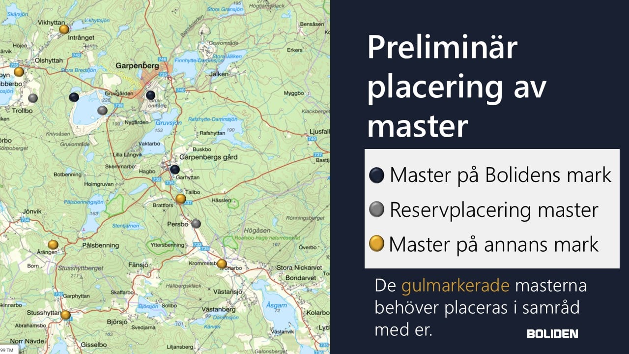 Nästa steg i projektet är att bestämma antal master och exakt placering av dessa, samt att komma överens med berörda markägare. Felicia Norén, ansvarig för fastighetsfrågor inom Boliden, kommer kontakta berörda markägare för vidare dialog.